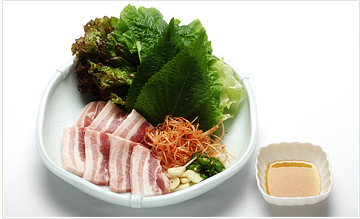 黒豚バラ肉の塩焼きをチシャなどにしらがねぎ